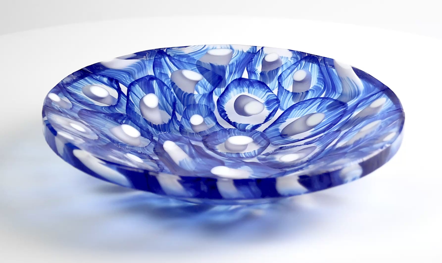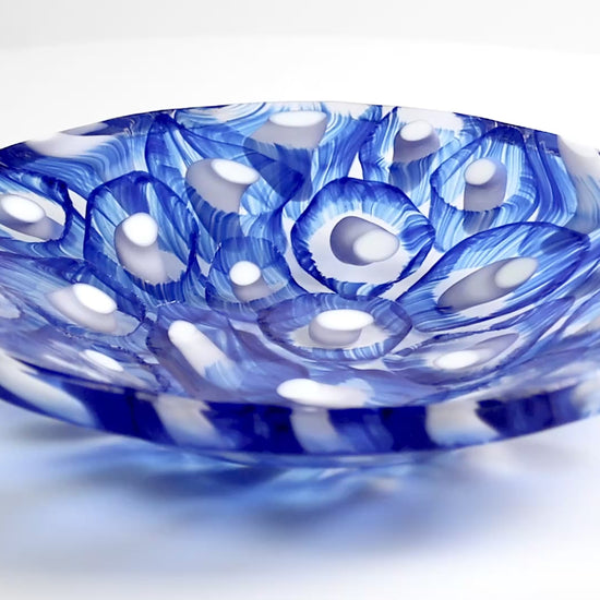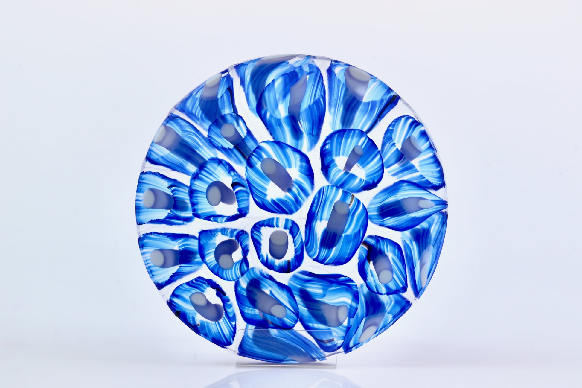 Discover the magic of Lumen Flux - a hand-fused glass plate where the magic of abstraction stands out in translucent crystal. Dark blue tones blend in hypnotic patterns. Crystal transparent parts emphasize the natural properties of glass, where the tangible merges with the intangible.