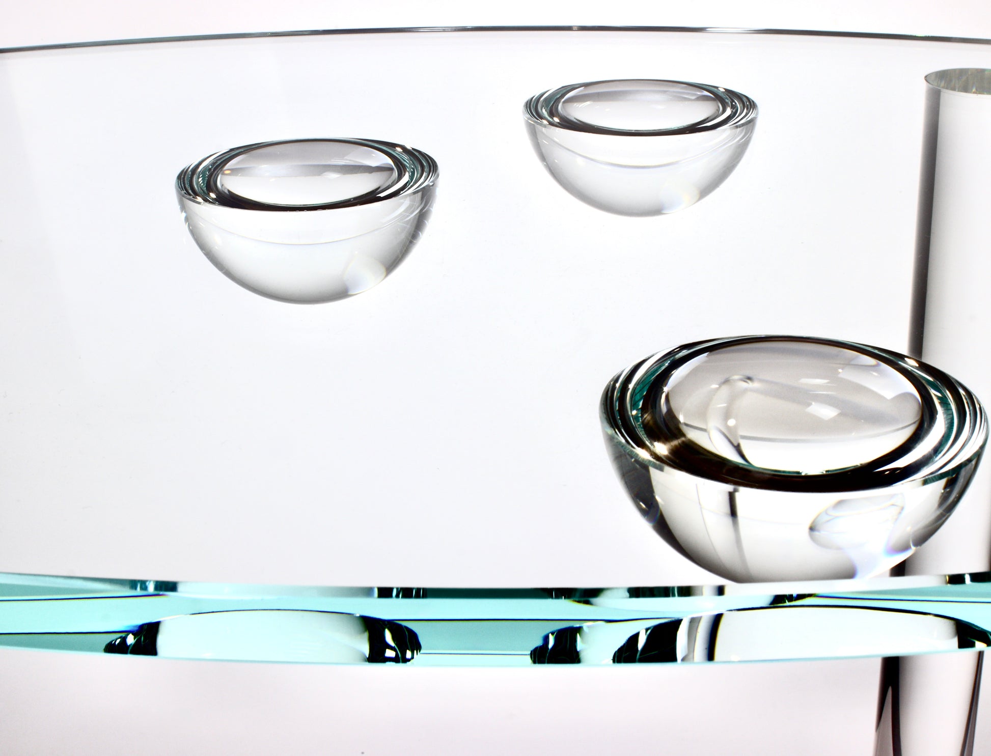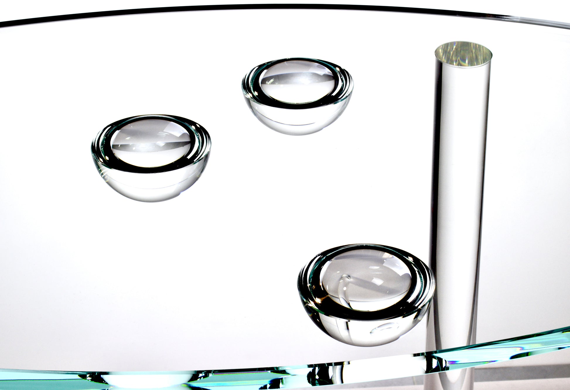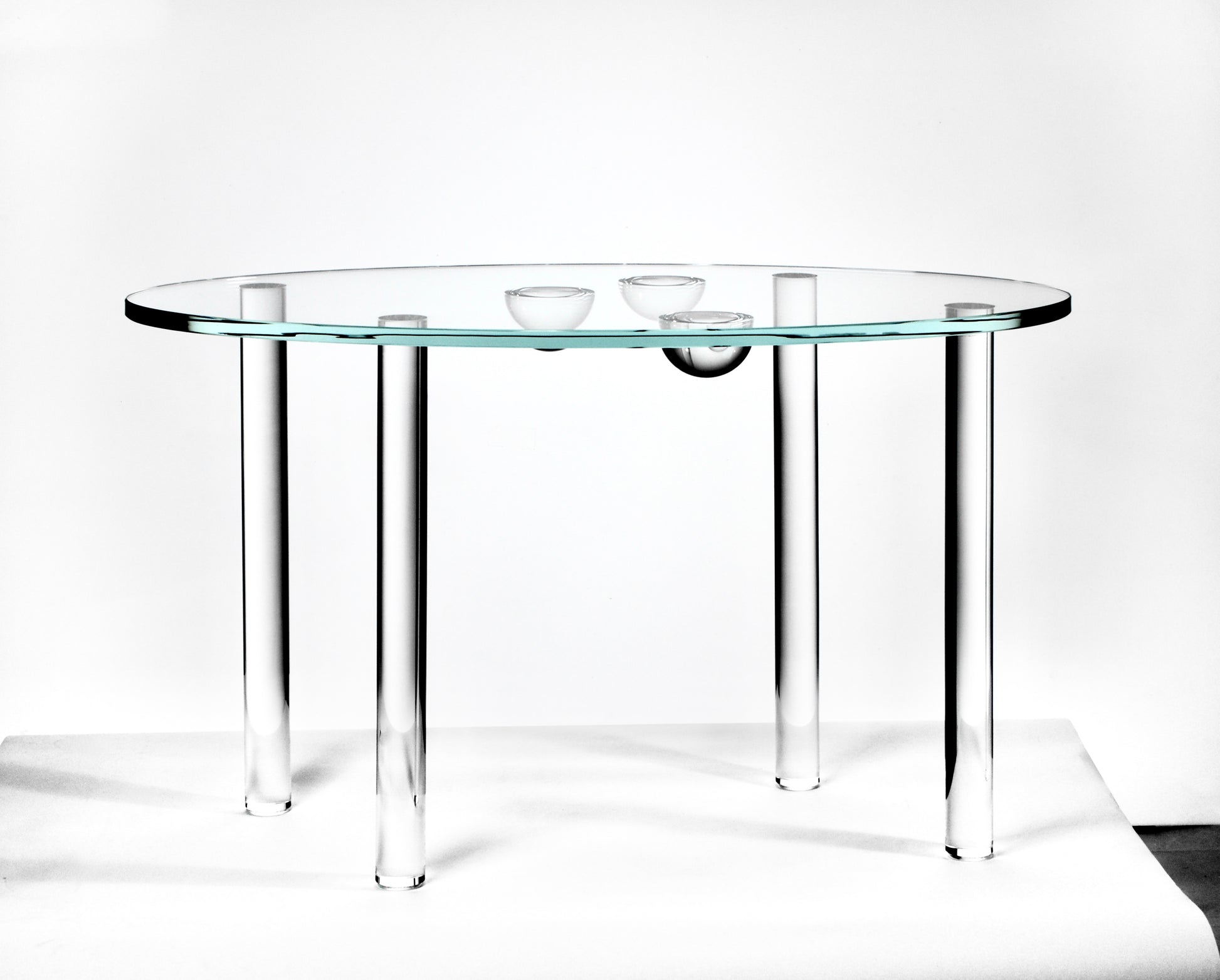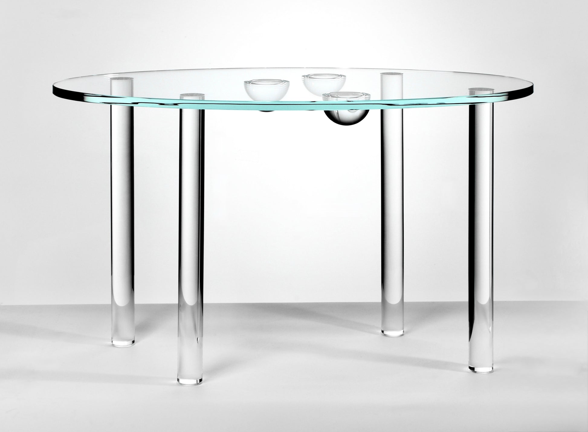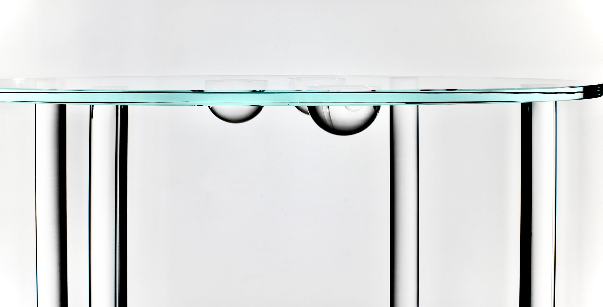 U celoskleněného stolku Solara Ellipse nesou průzračnou eliptickou desku z extra čirého skla čtyři precizně tvarované kulaté nohy. V centrální části spodní strany desky je decentně umístěná drobná kompozice skleněných polokoulí – jemný detail, který vytváří velmi subtilní a proměnlivou hru světla.